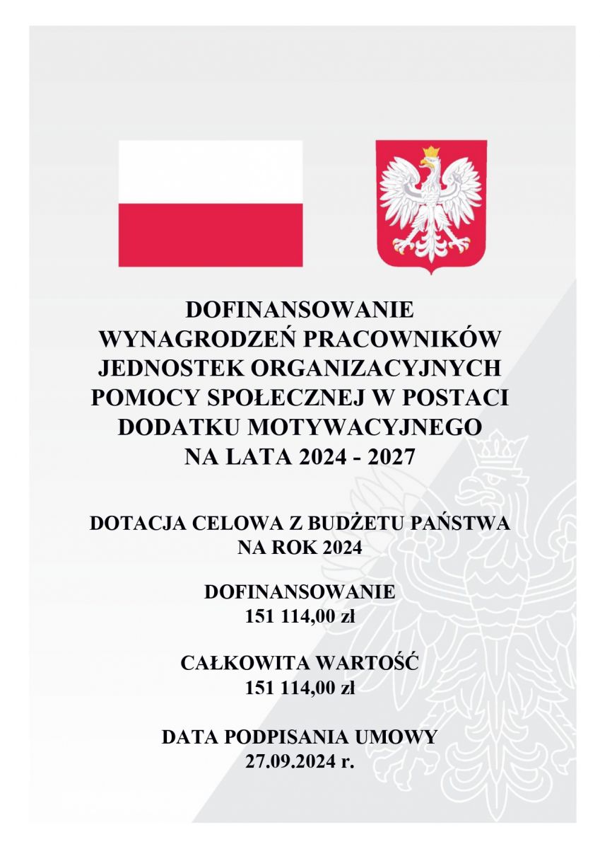 Całkowita wartość środków pozyskanych w 2024 roku w ramach programu „Dofinansowanie wynagrodzeń pracowników jednostek organizacyjnych pomocy społecznej w postaci dodatku motywacyjnego na lata 2024-2027” wynosi 151.114,00 zł.