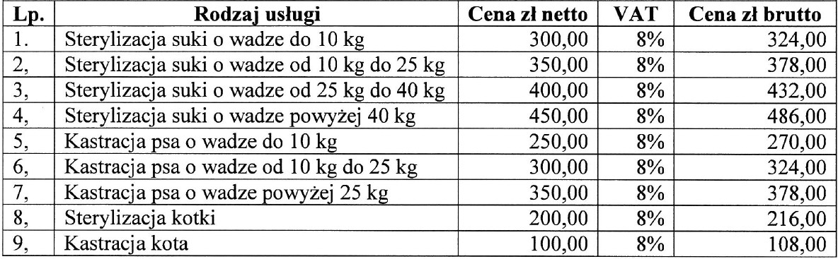 Przedmiotem akcji w stosunku do zwierząt właścicielskich jest sterylizacja kotek i suk kastracja kotów i psów. Akcja polega na dofinansowaniu z budżetu Gminy Łęczna kosztów zabiegu sterylizacji lub kastracji właścicielom zwierząt zamieszkującym na terenie Gminy Łęczna w wysokości 50% od kwoty wykazanej w poniższej tabeli.