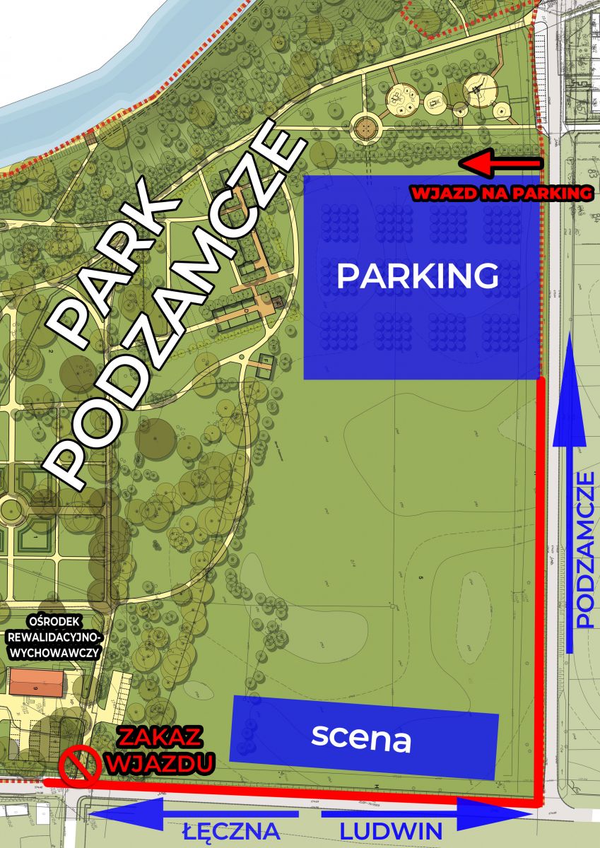 Przygotowaliśmy dla Państwa prosty plan Parku Podzamcze przedstawiający strefę parkingową oraz miejsca z zakazem wjazdu.